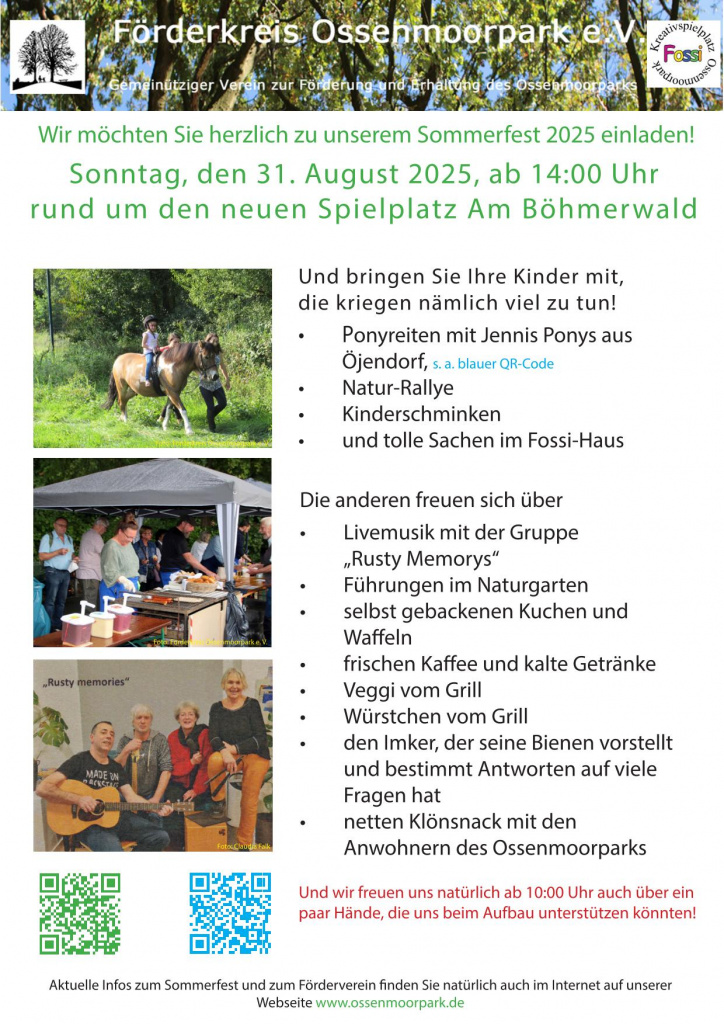 ![]() ![]() ![]() ![]() | Neue Spielplatzerweiterung am Böhmerwald Zu Ostern 2025 sollen die Bauzäune nicht mehr da sein und der Spielplatz zur Nutzung wieder freigegeben werden. Schauen Sie gerne vorbei und probieren aus, was Ihnen gefällt. Einige Wermutstropfen bleiben: – es gibt keinen Mühlsteingrill mehr. – der Platz, auf dem wir bisher unser Sommerfest gestalten konnten, ist so nicht mehr vorhanden. Vielleicht haben Sie Lust mit uns darüber nachzudenken, wie wir das bewältigen können. Wir freuen uns auf konstruktive Vorschläge von Ihnen!! Wie immer gern an info@ossenmoorpark.de |